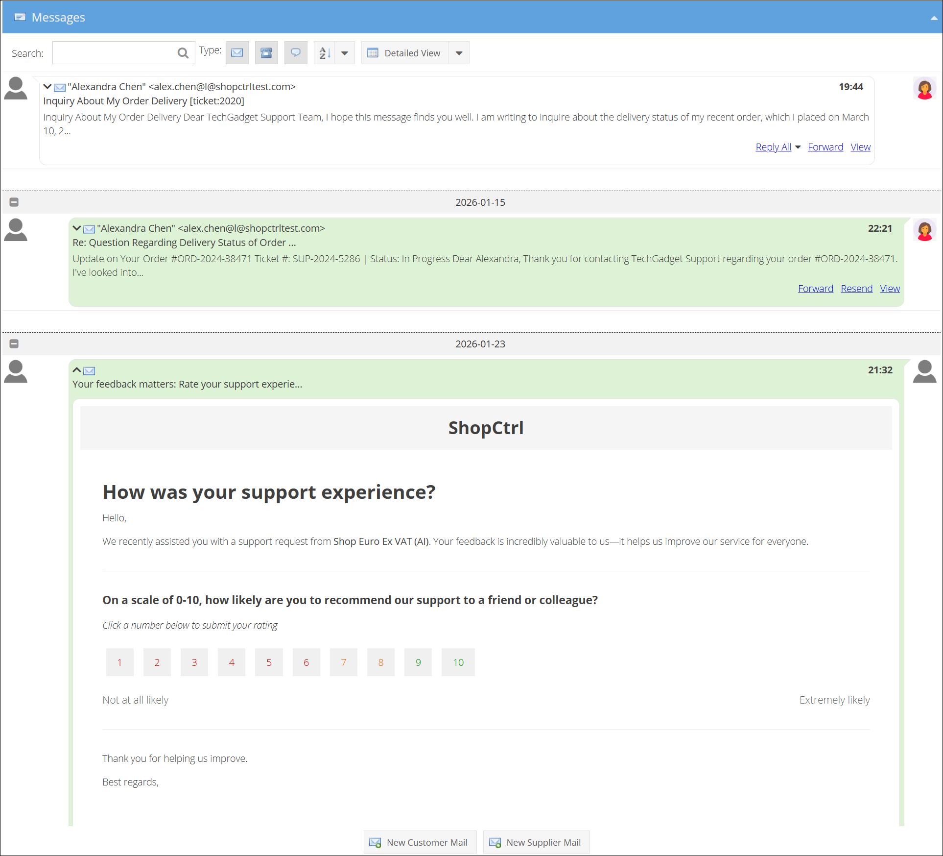 Data Collection: Customer ratings (1-10) are recorded at the ticket level. The mail is linked to the ticket, so you can view it.