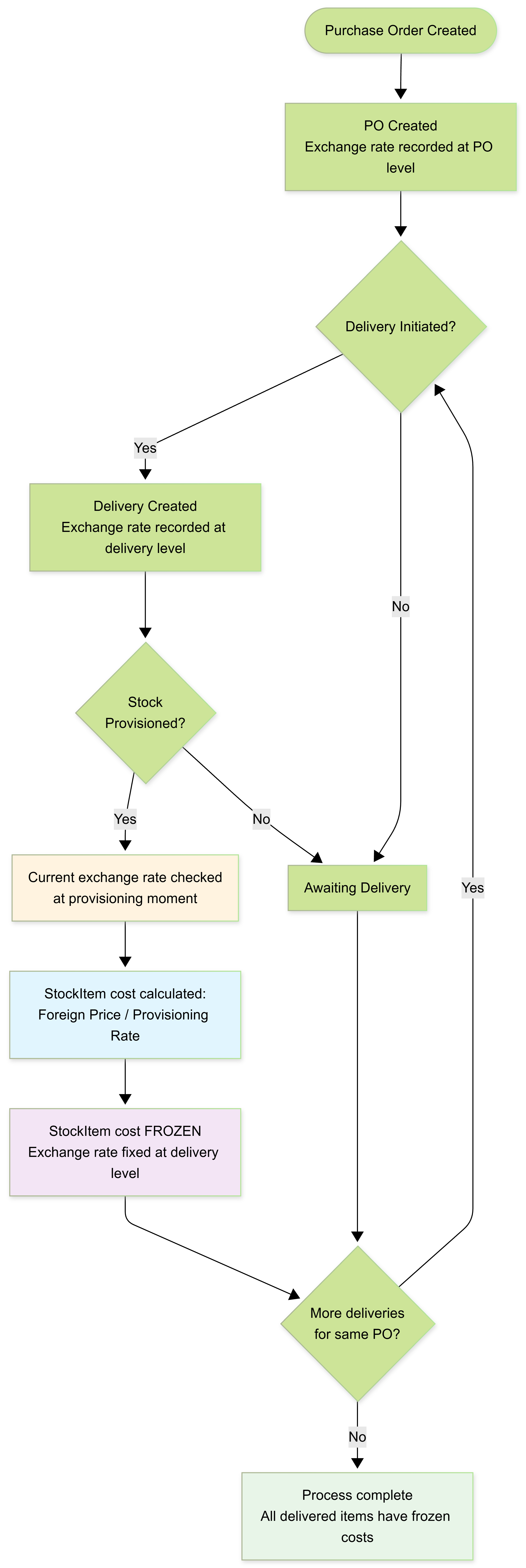 Stock item costs are frozen upon delivery. When products are provisioned to your warehouse, their purchase price in base currency is locked using the exchange rate at that time. This is done so that even if the exchange rate on the PO changes later, the cost of items already delivered remains consistent and traceable.