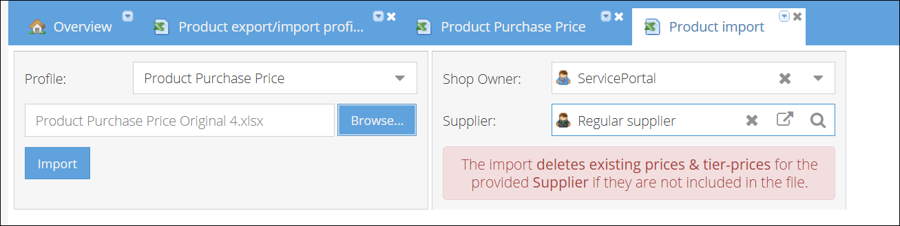 The import deletes existing prices & tier-prices for the provided Supplier if they are not included in the file.